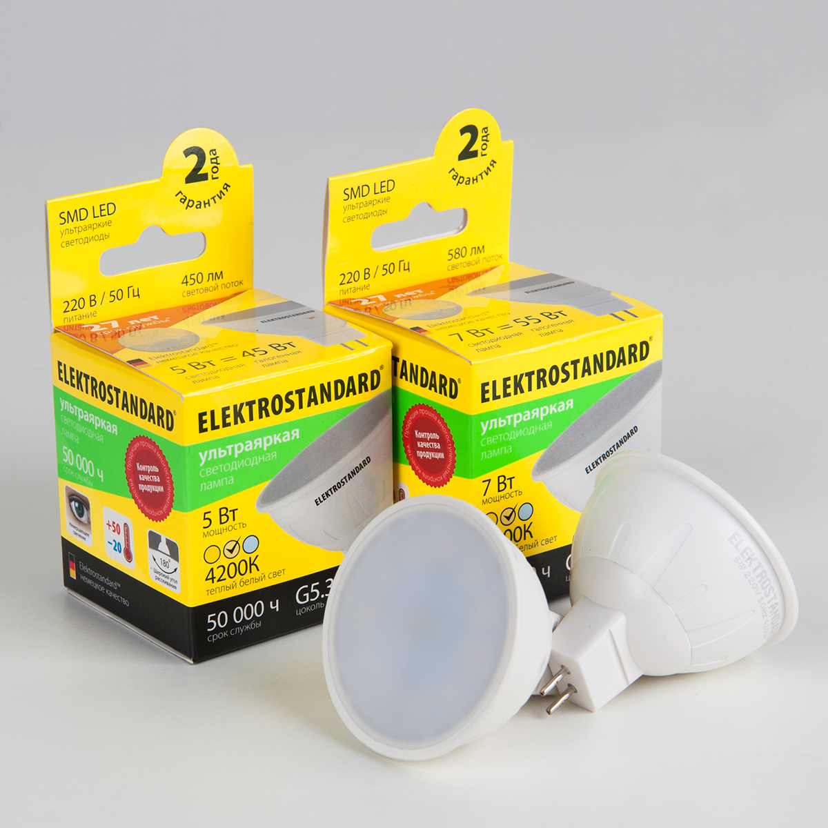 Лампа светодиодная 220В, 5Вт, цоколь G5.3, свет теплый белый 3300К. Угол рассеивания 180°.Срок службы светодиодов 50 000 ч. Светодиодные лампы Elektrostandard можно устанавливать во все светильники, в которых ранее использовались лампы накаливания или галогенные лампы.